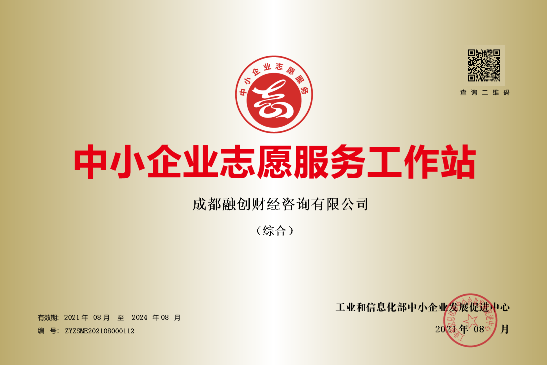 近日,成都融創(chuàng )財經(jīng)咨詢(xún)有限公司(以下簡(jiǎn)稱(chēng)融創(chuàng )財經(jīng))獲得了工信部頒發(fā)的全國第一批“中小企業(yè)志愿服務(wù)工作站”的榮譽(yù)稱(chēng)號,這表示融創(chuàng )財經(jīng)對中小企業(yè)的服務(wù)幫助工作得到了政府部門(mén)的認可與支持。